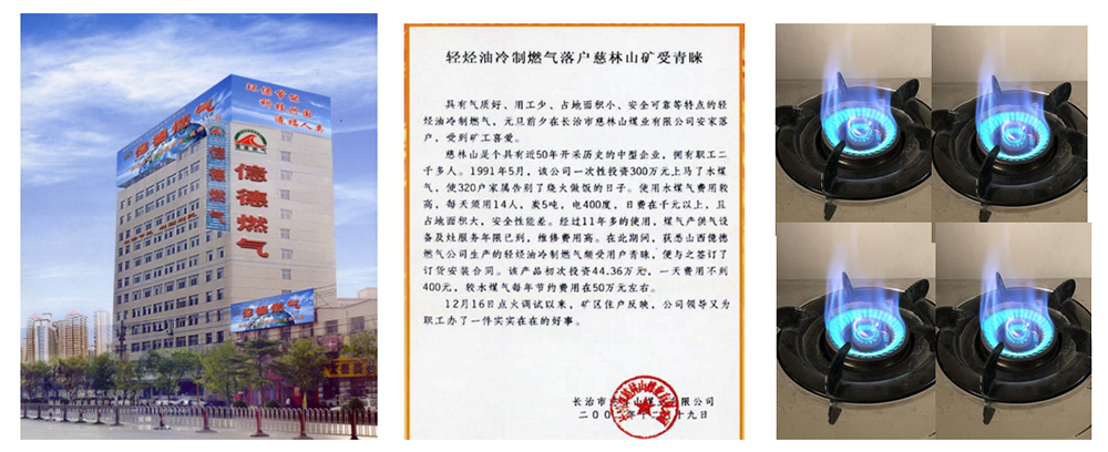 輕烴冷制燃?xì)猓?993年前研究的也是加溫制氣,做了107戶供氣,輕烴加溫36度以上就產(chǎn)氣,天氣冷,每天多次排殘液、管道每天排3~5(水)桶凝液(輕烴),火勢(shì)不穩(wěn),也威脅安全,準(zhǔn)備放棄改煤氣;國(guó)務(wù)院要求發(fā)展油制氣,研究不加溫試試,根據(jù)汽車用水降溫,摩托車用風(fēng)降溫不拉缸原理啟示,不兌任何添加劑,將輕烴完全汽化,解決了殘液、凝液?jiǎn)栴},專門改裝了1梯6戶,室外明管不保溫,在零下23度沒(méi)有凝液,經(jīng)完善達(dá)到了供氣穩(wěn)定的目的,承建了多個(gè)小區(qū),常溫低壓供氣,使用穩(wěn)定,找不到任何缺點(diǎn);于2003~2005年八次向黨中央,國(guó)務(wù)院、有關(guān)部委報(bào)《喜報(bào)》:得到了大力支持,定為《國(guó)家鼓勵(lì)發(fā)展的資源節(jié)約綜合利用和環(huán)境保護(hù)技術(shù)項(xiàng)目》、《免稅項(xiàng)目》和《城市燃?xì)狻贰?/span>